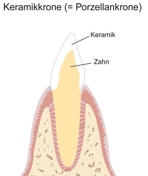 Zwar muss vergleichsweise mehr Zahnsubstanz abgeschliffen werden, um die Krone zu befestigen, aber sie sind gut verträglich und unempfindlich gegenüber Temperaturreizen. Sie können unter Umständen etwas leichter als andere Kronen brechen, früher kamen sie deshalb nur im Bereich der Vorderzähne zur Anwendung. Dort sind die Dehnungskräfte am geringsten und die Ästhetik am wichtigsten. Mittlerweile gibt es verbesserte vollkeramische Systeme, die Vollkeramikkronen auch im Seitenzahnbereich möglich machen.