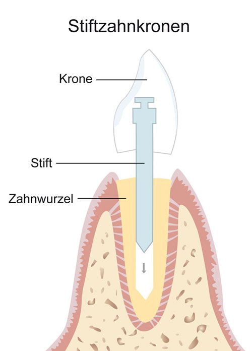 Die Stiftkrone kommt bei stark beschädigten Zähnen zum Einsatz. Kronen ohne Stift hätten hier nicht genügend Halt. Der Stift besteht aus Metall, Keramik oder Karbon.