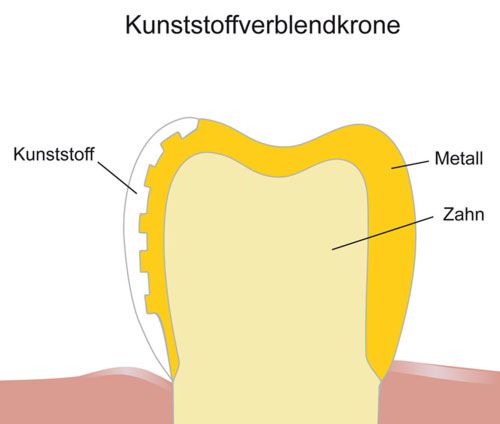Der innere Teil der Krone besteht aus einem Metall, meist Gold. Der äußere Teil besteht ebenfalls aus Metall. Er ist aber in der Regel mit zahnfarbenem Material verblendet.
